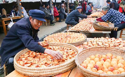 11月19日,蒙山人家景区农人在加工柿子。当日,山东沂蒙山旅行景区举办“柿子文化节”,展现当地传统的柿饼加工工艺,约请游客品味柿子,并体会手艺制造柿饼。