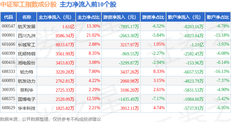 资金流向方面,中证军工(399967)指数成份股当日主力资金净流出算计22.02亿元,游资资金净流入算计12.03亿元,散户资金净流入算计9.98亿元。成份股资金流向概况见下表: